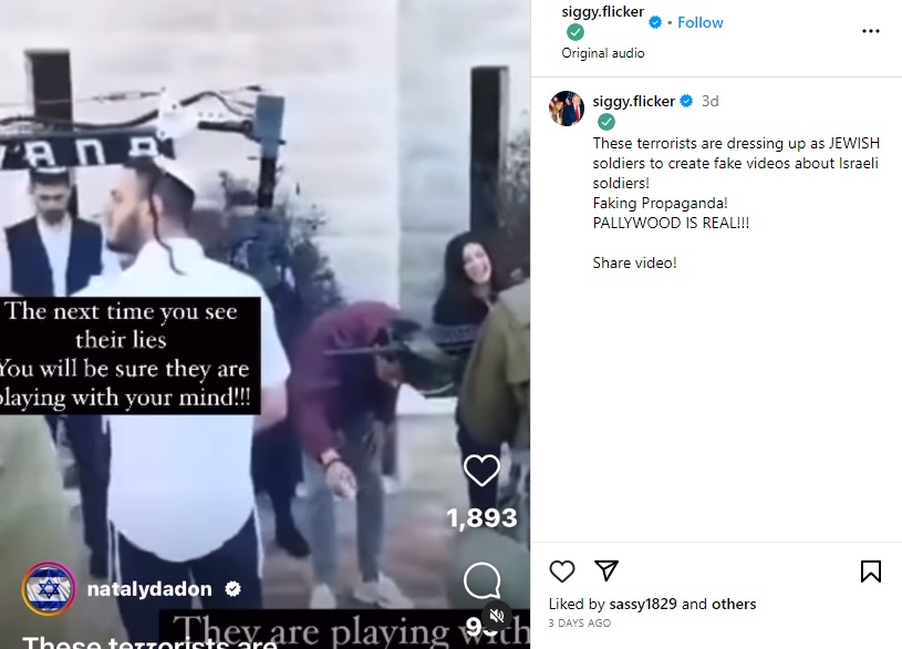 มีข้อมูลบิดเบือนเผยแพร่ทางสื่อสังคมออนไลน์ในต่างประเทศ เมื่อมีการแชร์หลักฐานว่าปาเลสไตน์ว่าจ้างนักแสดงมาสวมบทผู้ประสบภัย (Crisis Actors) เพื่อให้สถานการณ์ผู้เสียชีวิตและบาดเจ็บในกาซารุนแรงเกินจริง ทั้งภาพการตกแต่งบาดแผลให้ดูคล้ายกับผู้ประสบภัยจากเหตุระเบิด และภาพกองถ่ายภาพยนตร์ที่เด็กชาวอาหรับได้รับบาดเจ็บ