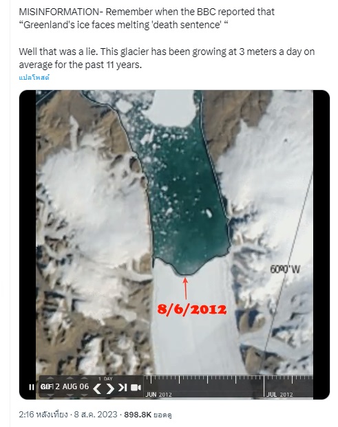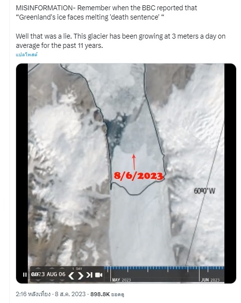 มีข้อมูลเท็จเผยแพร่ทาง X(Twitter) ในสหรัฐอเมริกา โดยอ้างว่าธารน้ำแข็งปีเตอร์มันน์ซึ่งอยู่ทางตอนเหนือของดินแดนกรีนแลนด์และใกล้กับบริเวณขั้วโลกเหนือ มีปริมาณน้ำแข็งเพิ่มขึ้น เพราะเมื่อนำภาพถ่ายดาวเทียมธารน้ำแข็งของปี 2012 และ 2023 มาเปรียบเทียบกัน พบว่ามีน้ำแข็งเพิ่มขึ้น พร้อมย้ำว่าตลอด 11 ปีที่ผ่านมา น้ำแข็งในธารน้ำแข็งปีเตอร์มันน์มีการขยายตัวเพิ่มขึ้นเฉลี่ย 3 เมตรต่อวัน แสดงให้เห็นว่าธารน้ำแข็งในดินแดนกรีนแลนด์และแถบขั้วโลกเหนือไม่ได้ลดลงเหมือนที่กลุ่มรณรงค์การเปลี่ยนแปลงสภาพภูมิอากาศและสื่อกระแสหลักพยายามนำเสนอ