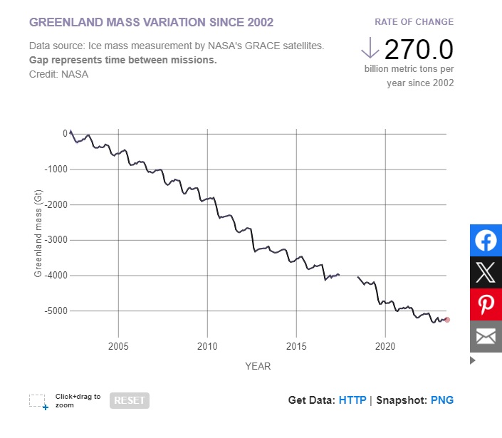 ส่วนดินแดนกรีนแลนด์มีอัตราการสูญเสียน้ำแข็งปีละ 2.7 แสนล้านเมตริกตัน หรือสูญเสียน้ำแข็งตั้งแต่การสำรวจเมื่อปี 2002 ไปแล้ว 5.2 ล้านล้านเมตริกตัน