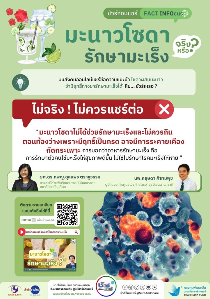 เพราะฉะนั้น มะนาวโซดารักษามะเร็ง มั่ว อย่าแชร์ ยังไม่รับรองผลทางการแพทย์ ขออย่าเพิ่งแชร์ ถ้าไม่มีข้อมูลชัดเจนไม่ควรแชร์