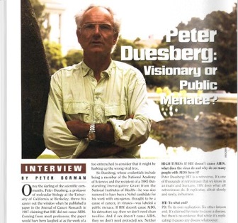 กระทั่งปี 1996 ปีเตอร์ ดูสเบิร์ก ได้ตีพิมพ์หนังสือที่ชื่อว่า Inventing the AIDS Virus ซึ่งเนื้อหาเต็มไปด้วยแนวคิด AIDS Denialism ที่ขัดแย้งข้อเท็จจริงทางวิทยาศาสตร์จำนวนมาก