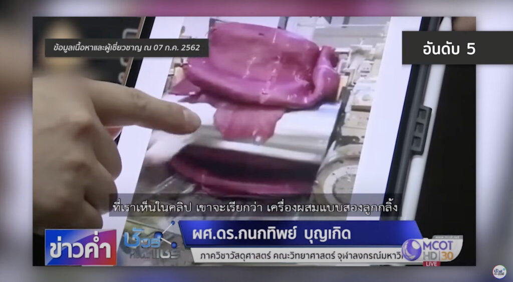 “คลิปที่แชร์กันเป็นกระบวนการหนึ่งในการการเตรียมผลิตภัณฑ์ยาง ไม่ใช่การผลิตเนื้อแต่อย่างใด เครื่องที่เห็นในคลิปเรียกว่าเครื่อง Two Roll Mill ไว้สำหรับผสมส่วนผสมทางเคมีต่างๆ ให้เข้าเนื้อกันได้ดีขึ้น”