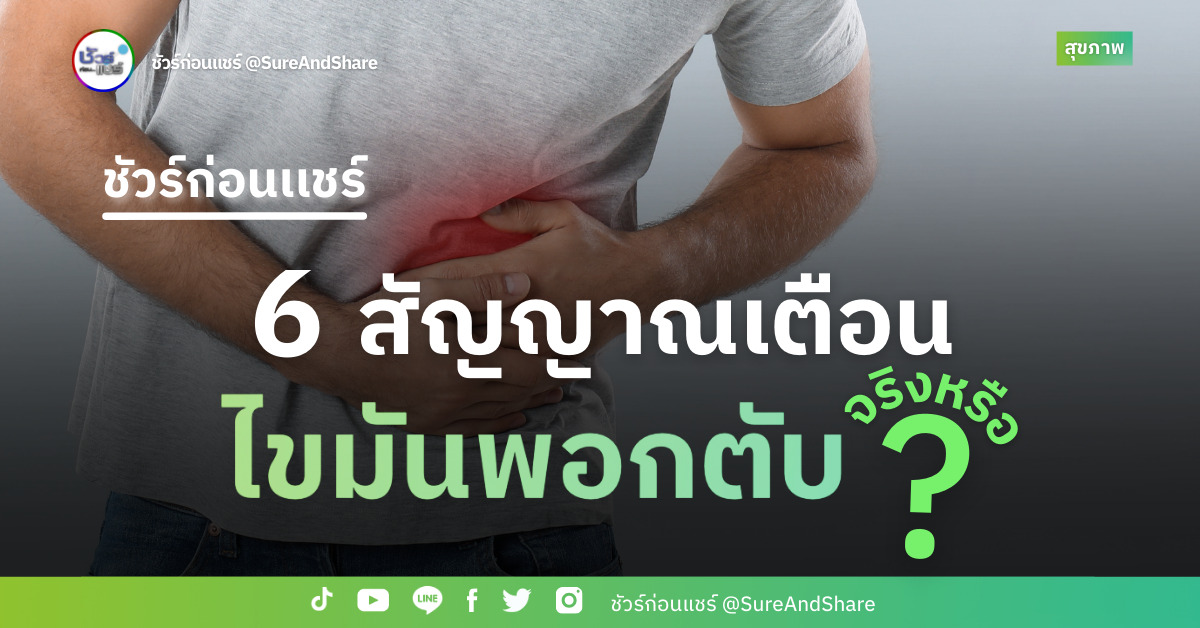 บนสื่อสังคมออนไลน์มีการแชร์ 6 สัญญาณเตือนไขมันพอกตับ เช่น อ่อนเพลียไม่ทราบสาเหตุ จุกแน่นท้อง เบื่ออาหาร จุกชายโครงขวา นอนไม่หลับ และคันตามผิวหนัง