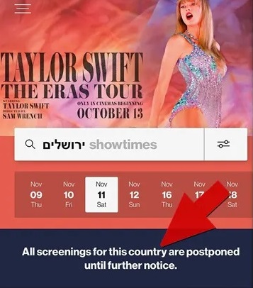 ข้ออ้างดังกล่าว เกิดขึ้นเมื่อแฟนเพลงที่ต้องการซื้อตั๋ว The Eras Tour ผ่านทางเว็บไซต์ tstheerastourfilm.com เมื่อวันที่ 6 พฤศจิกายน ต้องพบว่าระบบไม่สามารถซื้อตั๋วได้ ทั้งการโชว์รอบฉายในประเทศรอบ ๆ อิสราเอลขึ้นมาแทน รวมถึงการขึ้นข้อความว่า “การฉายในทุกรอบในประเทศนี้ถูกเลื่อนออกไปจนกว่าจะมีการแจ้งภายหลัง” (All screenings for this country are postponed until further notice)