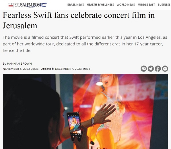 เมื่อวันที่ 6 พฤศจิกายน เว็บไซต์หนังสือพิมพ์ Jerusalem Post ได้รายงานบรรยากาศการชม The Eras Tour ในโรงภาพยนตร์ Yes Planet ที่กรุงเยรูซาเล็มเมื่อคืนวันเสาร์ที่ 4 พฤศจิกายน