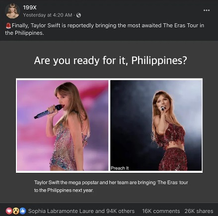 เมื่อวันที่ 12 พฤศจิกายน มีการแชร์ข้อความทาง Facebook ในประเทศฟิลิปปินส์ ที่อ้างว่า เทย์เลอร์ สวิฟต์ ได้เพิ่มฟิลิปปินส์ในตารางคอนเสิร์ต The Eras Tour ประจำปี 2024 กลายเป็นข้อความที่มียอดแชร์สูงกว่า 25,000 ครั้งและยอดคอมเมนต์กว่า 16,000 ความเห็น