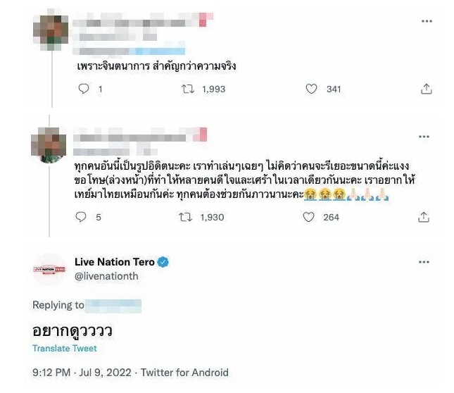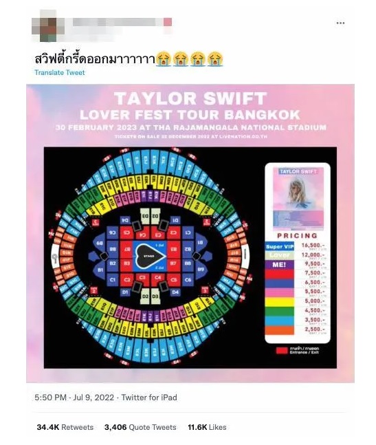 ในช่วงเดือนกรกฎาคม 2023 มีผู้ใช้บัญชี X ในเมืองไทยแชร์ผังที่นั่งคอนเสิร์ตและราคาบัตรคอนเสิร์ตเทย์เลอร์ สวิฟต์ในเมืองไทยเช่นเดียวกัน
