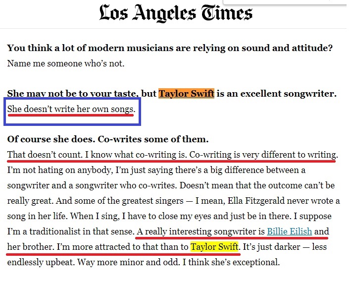 ผู้สัมภาษณ์จึงโต้แย้งว่า ปัจจุบันยังมีนักร้องนักแต่งเพลงคุณภาพอยู่ โดยเลือก เทย์เลอร์ สวิฟต์ มาเป็นตัวอย่าง