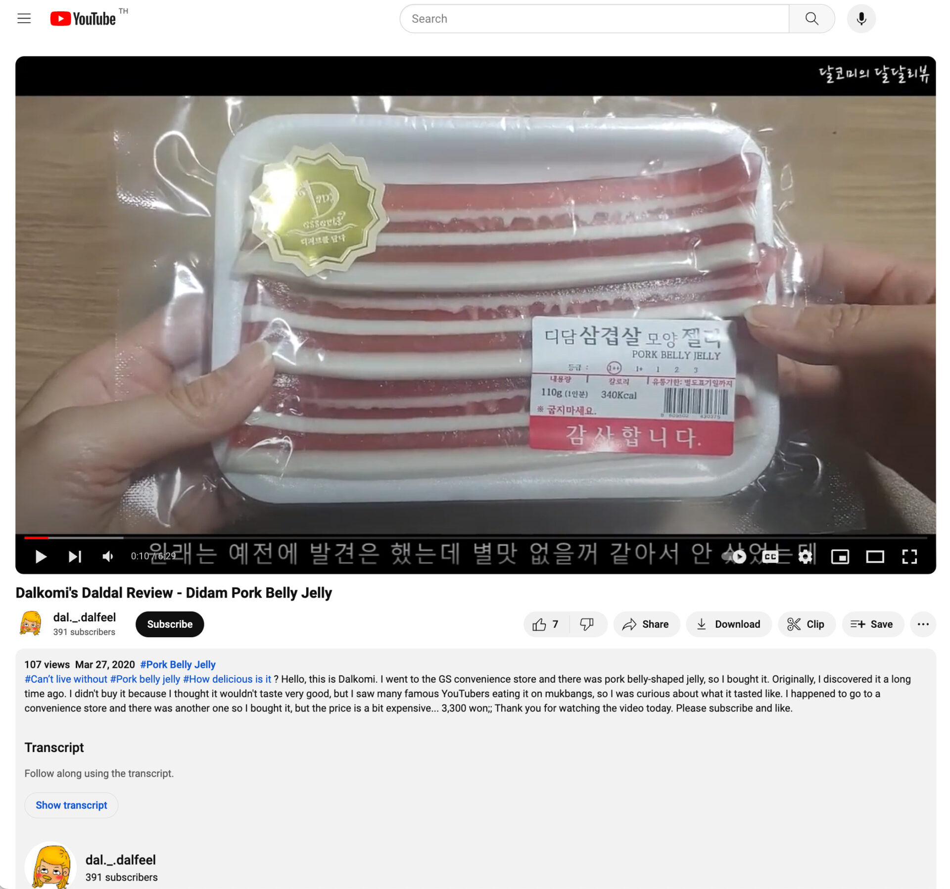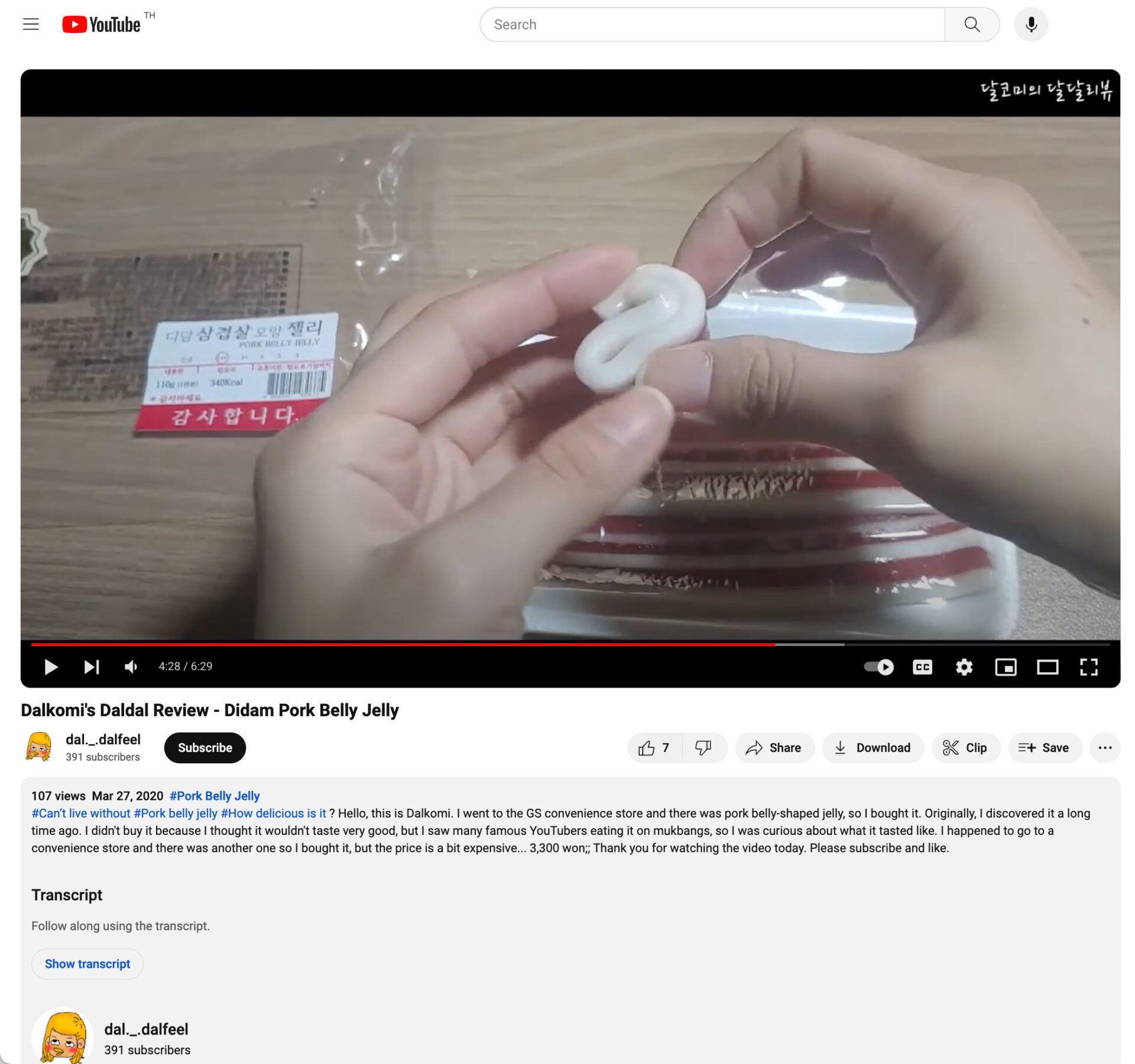 🔍 เมื่อนำวิดีโอในคลิปไปตรวจวิเคราะห์เพื่อหาต้นตอ พบว่ามีเบาะแสที่สำคัญ คือ ภาพการติดฉลาก ในช่วงนาทีที่ 02.26 และเมื่อนำภาพดังกล่าวไปตรวจสอบค้นหาภาพกับเว็บ Baidu ก็พบว่าเป็นผลิตภัณฑ์ที่มีวางขายอยู่ทั่วไป ซึ่งมีฉลากเป็นภาษาเกาหลี เขียนว่า 디담 삼겹살 모양 젤리 หรือ DIDAM PORK BELLY JELLY