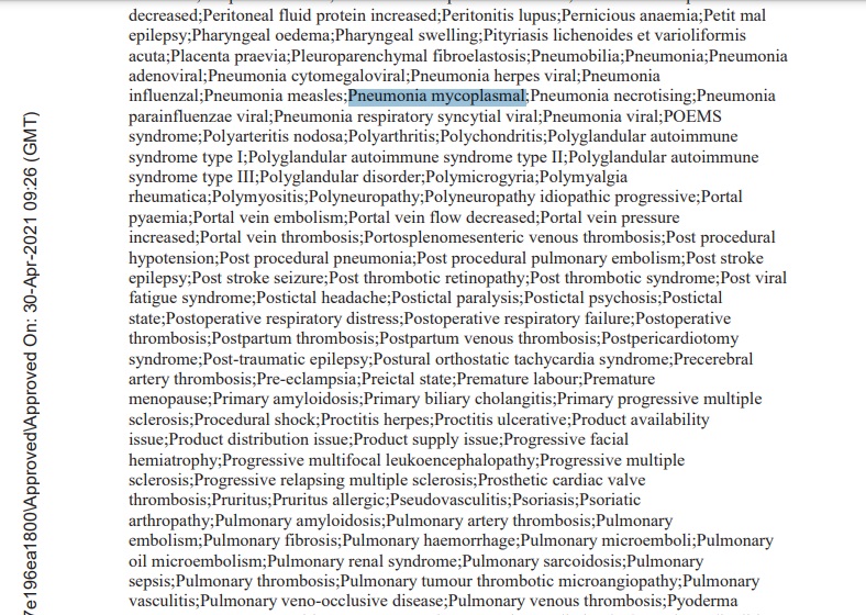 ดังนั้น การระบุ Pneumonia Mycoplasma หรือโรคปอดอักเสบจากการติดเชื้อแบคทีเรียไมโครพลาสมา อยู่ในรายชื่ออาการไม่พึงประสงค์ที่ต้องเฝ้าระวังเป็นพิเศษ จากวัคซีนโควิด-19 ของบริษัท Pfizer-BioNTech ไม่ได้หมายความว่า โรคปอดอักเสบคืออาการข้างเคียงหรืออาการไม่พึงประสงค์ของวัคซีนแต่อย่างใด