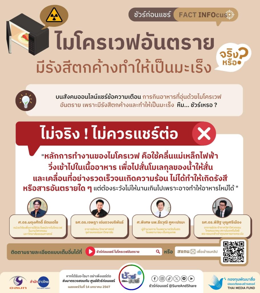 ตามที่มีข้อความเตือน การกินอาหารที่อุ่นด้วยไมโครเวฟอันตราย เพราะมีรังสีตกค้างและทำให้เป็นมะเร็งนั้น