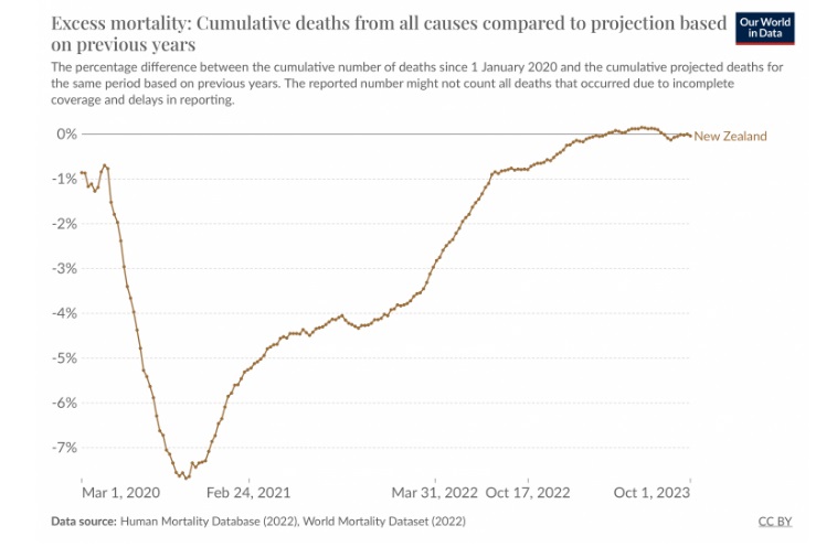 ข้อมูลจาก Our World in Data พบว่า อัตราการเสียชีวิตส่วนเกิน (Excess Deaths) ของนิวซีแลนด์ที่ดูเหมือนจะเพิ่มขึ้นหลังการรณรงค์วัคซีนโควิด-19 แท้จริงแล้วเป็นอัตราการเสียชีวิตที่กลับมาอยู่ในระดับปกติ หลังอัตราการเสียชีวิตลดต่ำลงอย่างมากในช่วงการระบาดของโควิด-19