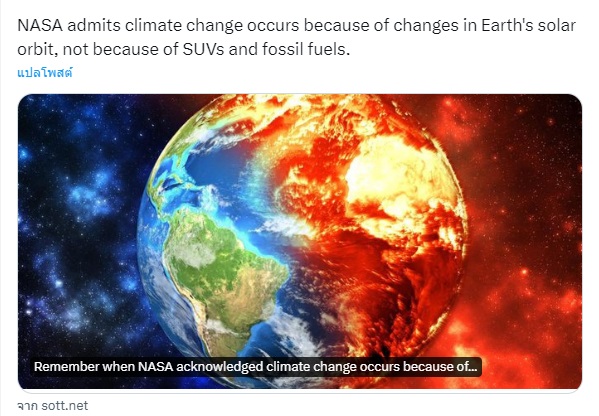 มีข้อมูลเท็จเผยแพร่ทาง X (Twitter) ในต่างประเทศ อ้างว่าองค์การนาซายืนยันว่าสาเหตุที่ทำให้โลกเข้าสู่สภาวะโลกร้อนหรือ Global Warming มีสาเหตุจากการเปลี่ยนแปลงวงโคจรของโลกกับดวงอาทิตย์ หรือที่เรียกว่า วัฏจักรมิลานโควิตช์ (Milankovitch Cycles) และไม่ได้มีสาเหตุเพราะก๊าซเรือนกระจกจากกิจกรรมของมนุษย์ตามที่วงการวิทยาศาสตร์ด้านสิ่งแวดล้อมกล่าวอ้าง
