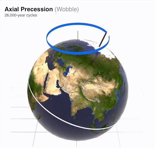 - การหมุนควงของแกนโลก (Precession) (ใช้เวลาประมาณ 26,000 ปี)
