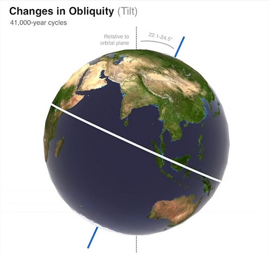 - ความเอียงของแกนโลก (Obliquity) จาก 22.1 องศาเป็น 24.5 องศา (ใช้เวลาประมาณ 41,000 ปี)