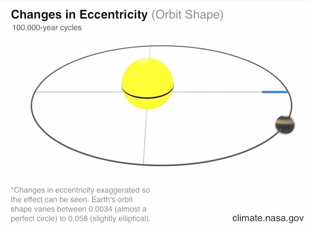 - วงโคจรของโลกรอบดวงอาทิตย์ (Eccentricity) จากวงกลมเป็นวงรี (ใช้เวลาประมาณ 100,000 ปี)