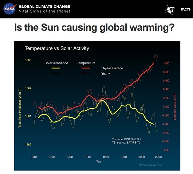 หลักฐานที่ NASA พบว่า สภาวะโลกร้อนในปัจจุบันไม่มีความเกี่ยวข้องกับอิทธิพลของดวงอาทิตย์ มีด้วยกัน 2 ประการ