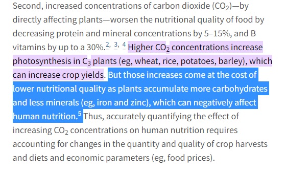 - งานวิจัยพบว่าการเพิ่ม CO2 ทำให้พืช C3 ให้ผลผลิตมากขึ้น แต่ผลผลิตกลับมีคุณค่าทางโภชนาการลดลง