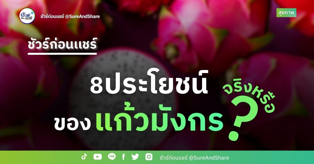 บนสื่อสังคมออนไลน์มีการแชร์ว่า “แก้วมังกร” ผลไม้ของสายสุขภาพ มีประโยชน์อย่างน้อย 8 อย่าง เช่น แหล่งสารต้านอนุมูลอิสระ ช่วยต่อสู้โรคเรื้อรัง มีไฟเบอร์สูง มีพรีไบโอติก เสริมภูมิคุ้มกัน อุดมด้วยธาตุเหล็ก บำรุงหัวใจ และบำรุงผิว