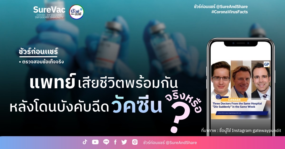 มีข้อมูลเท็จเผยแพร่ทาง Instagram ในสหรัฐอเมริกา เมื่อปี 2022 โดย Gateway Pundit เว็บไซต์ที่มีประวัติเผยแพร่ข่าวปลอมเกี่ยวกับวัคซีนโควิด-19 อ้างว่า แพทย์ 3 รายในโรงพยาบาลของประเทศแคนาดา ต้องเสียชีวิตในระยะเวลาแค่สัปดาห์เดียวกัน สาเหตุมาจากนโยบายบังคับให้บุคลากรทางการแพทย์ต้องฉีดวัคซีนโควิด-19 เข็มที่ 4 นั่นเอง
