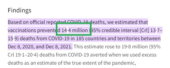 งานวิจัยของมหาวิทยาลัย Imperial College London ที่ตีพิมพ์ในวารสารการแพทย์ Lancet เมื่อเดือนสิงหาคมปี 2022 พบว่าในช่วง 1 ปีแรกของการใช้งาน วัคซีนโควิด-19 ช่วยป้องกันการเสียชีวิตของประชากรโลกได้ถึง 14.4 ล้านคน
