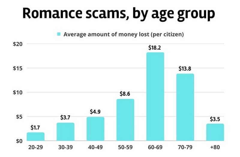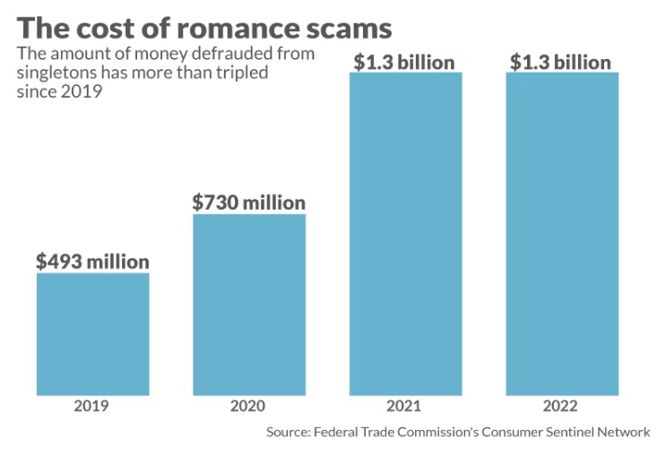 ข้อมูลจากคณะกรรมาธิการว่าด้วยการค้าแห่งสหพันธรัฐ (Federal Trade Commission หรือ FTC) พบว่าในปี 2022 มีชาวอเมริกันตกเป็นเหยื่อ Romance Scam มากกว่า 70,000 ราย รวมมูลค่าความเสียหาย 1.3 พันล้านดอลลาร์สหรัฐฯ หรือเฉลี่ย 4,400 ดอลลาร์สหรัฐฯ ต่อราย (ประมาณ 154,000 บาท)