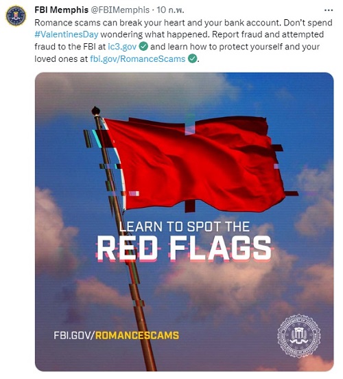 สำนักงานสอบสวนกลางของสหรัฐอเมริกา (Federal Bureau of Investigation หรือ FBI) ของเมืองเมมฟิส รัฐเทนเนสซี ได้ประกาศเตือนประชาชนจากการตกเป็นเหยื่อ Romance Scam เนื่องจากมีสถิติที่พบการหลอกลวงด้วยวิธี Romance Scam มากขึ้นในช่วงเทศกาลวันวาเลนไทน์