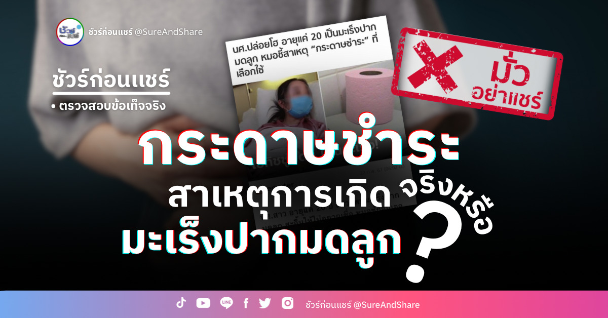 ศูนย์ชัวร์ก่อนแชร์ ตรวจสอบข้อมูลกับ ศ.พญ.สฤกพรรณ วิไลลักษณ์ อาจารย์แพทย์สาขาวิชามะเร็งวิทยานรีเวช ภาควิชาสูติศาสตร์-นรีเวชวิทยา คณะแพทยศาสตร์โรงพยาบาลรามาธิบดี มหาวิทยาลัยมหิดล ยืนยันว่า การใช้กระดาษทิชชู ไม่เกี่ยวข้องกับการเป็นต้นเหตุของโรคมะเร็งปากมดลูก