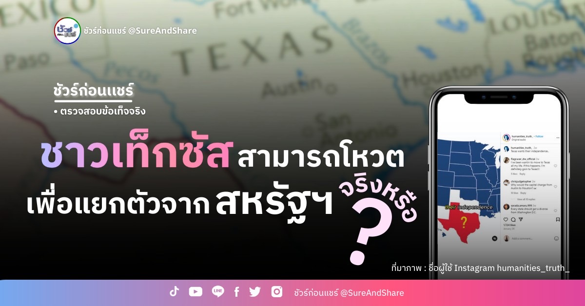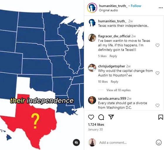 มีข้อมูลเท็จเผยแพร่ทาง Instagram ในสหรัฐอเมริกา โดยอ้างว่ารัฐเท็กซัส รัฐที่มีขนาดพื้นที่และจำนวนประชากรมากเป็นอันดับที่ 2 ของสหรัฐอเมริกา เตรียมประกาศเอกราชเพื่อแยกตัวจากสหรัฐอเมริกา จากปัญหาความขัดแย้งด้านนโยบายพรมแดนและผู้อพยพ ระหว่างรัฐเท็กซัสและรัฐบาลสหรัฐอเมริกาที่เริ่มต้นตั้งแต่เดือนมกราคม 2024 ที่ผ่านมา