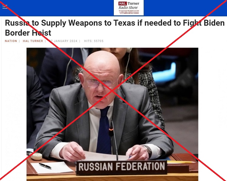 มีข้อมูลเท็จเผยแพร่ทาง TikTok และเว็บไซต์ในสหรัฐอเมริกา โดยอ้างว่าทางการของประเทศรัสเซียจะส่งอาวุธให้รัฐเท็กซัส เพื่อเตรียมพร้อมทำสงครามกับรัฐบาลกลางของสหรัฐอเมริกา โดยอ้างความเห็นของ วาซิลี นีบินเซีย เอกอัครราชทูตรัสเซียประจำสหประชาชาติ