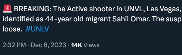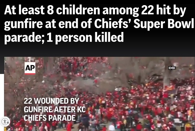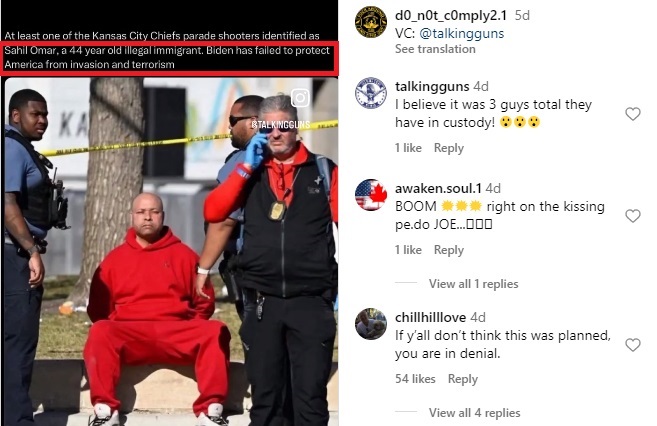 มีข้อมูลเท็จเผยแพร่ทางสื่อสังคมออนไลน์ในสหรัฐอเมริกา โดยอ้างว่าเหตุกราดยิงในงานพาเหรดฉลองแชมป์ซูเปอร์โบวล์ของทีม Kansas City Chiefs ในเมืองแคนซัส ซิตี้ เมื่อวันที่ 14 กุมภาพันธ์ 2024 และเป็นเหตุให้มีผู้เสียชีวิต 1 รายและบาดเจ็บจากอาวุธปืน 22 ราย เป็นฝีมือของผู้ก่อเหตุที่ชื่อว่า ชาฮิล โอมาร์ ซึ่งมีสถานะเป็นผู้หลบหนีเข้าเมืองอย่างผิดกฎหมายวัย 44 ปี นำไปสู่กระแสวิจารณ์นโยบายผู้อพยพของรัฐบาลสหรัฐฯ โดยโจมตีว่ารัฐบาลของนาย โจ ไบเดน ล้มเหลวด้านการป้องกันชีวิตชาวอเมริกัน จากการถูกจู่โจมและการก่อการร้าย