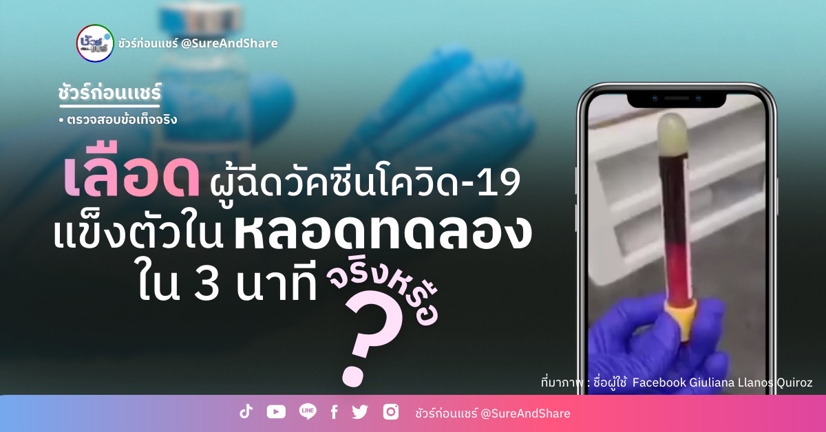 มีคลิปวิดีโอข้อมูลเท็จเผยแพร่ทาง Facebook โดยอ้างว่า เลือดจากผู้ฉีดวัคซีนโควิด-19 แข็งตัวในหลอดบรรจุในเวลาเพียงแค่ 3 นาที ถือเป็นเรื่องผิดปกติอย่างมาก เพราะปกติแล้วกว่าเลือดจะแข็งตัวในหลอดต้องใช้เวลาถึง 30 นาที