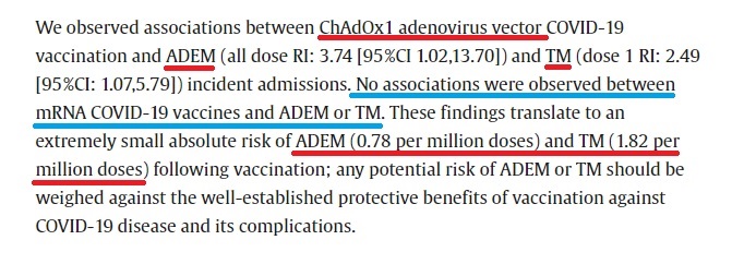 แม้จะพบความสัมพันธ์ระหว่างผู้รับวัคซีนโควิด-19 ชนิด Adenovirus Vector กับอาการอาการ ADEM และ TM แต่สัดส่วนการเกิดอาการดังกล่าวในผู้รับวัคซีนโควิด-19 ยังถือว่าน้อยมาก โดยสัดส่วนการพบผู้ป่วยอาการไขสันหลังอักเสบมีเพียง 1.82 ราย จากการรับวัคซีนจำนวน 1 ล้านโดส และพบผู้ป่วยโรคสมองอักเสบหลายตำแหน่งเฉียบพลันเพียง 0.78 ราย จากการรับวัคซีนจำนวน 1 ล้านโดส