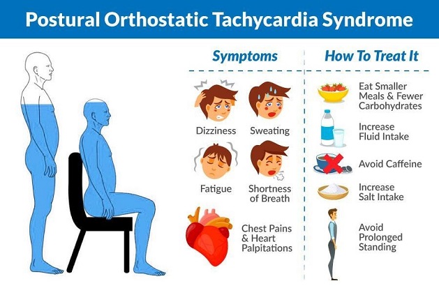 อาการหัวใจเต้นเร็วระหว่างเปลี่ยนท่าหรือ POTS คือ อาการใจสั่น แน่นหน้าอก หายใจลำบาก ปวดศีรษะ มึนศีรษะ หน้ามืด และหมดสติ เนื่องจากหัวใจเต้นเร็วมากกว่าปกติเวลาเปลี่ยนท่า เช่น ลุกขึ้นยืนหรือนั่ง