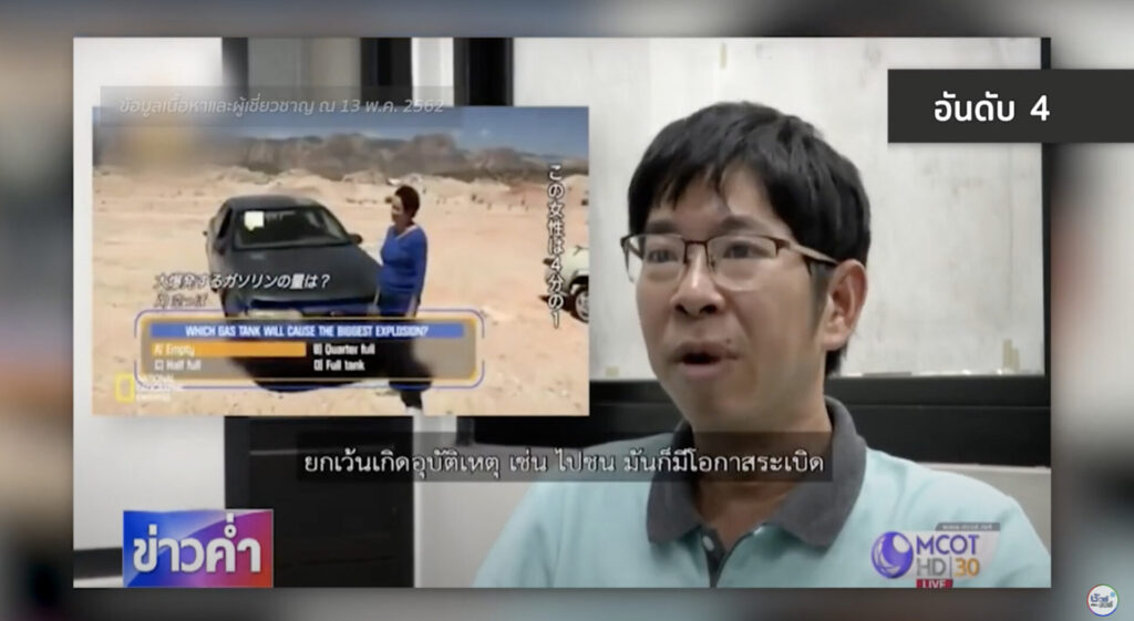 “โอกาสที่จะระเบิดจากการจอดรถตากแดดนั้นไม่มี เนื่องจากอุณหภูมิต้องสูงถึงจุดลุกติดไฟได้ หากเป็นน้ำมันแก๊สโซฮอล์ ประมาณ 300 องศาฯ หรือ 280 องศาฯ ซึ่งอุณหภูมิสูงขนาดนี้ไม่สามารถเกิดขึ้นได้ในภาวะปกติ ดังนั้นการเติมน้ำมันเต็มถังหรือไม่ประชาชนจึงไม่ต้องกังวล ส่วนคลิปที่แชร์มาแหล่งข้อมูลที่อ้างอิงเป็นเพียงแค่การทดสอบที่มีการควบคุมตัวแปรและการสร้างสถานการณ์เฉพาะเท่านั้น”