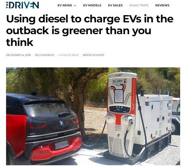 - สถานีชาร์จรถไฟฟ้าด้วยเครื่องปั่นไฟจากน้ำมันดีเซลในออสเตรเลีย สร้างขึ้นในสถานที่ซึ่งระบบไฟฟ้าส่วนกลางเข้าไม่ถึง