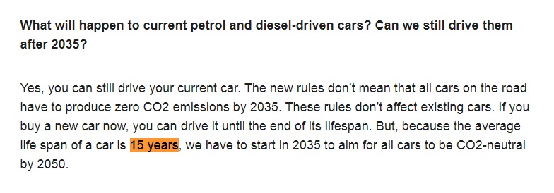 ในข้อความระบุว่า เนื่องจากยุโรปจะเข้าสู่สังคมความเป็นกลางทางคาร์บอนภายในปี 2050 จึงกำหนดการห้ามการขายรถยนต์สันดาปภายในประมาณปี 2035 เนื่องจากประเมินว่าอายุเฉลี่ยของการใช้งานรถยนต์หนึ่งคันคือ 15 ปี ดังนั้นเมื่อรถยนต์น้ำมันถูกจำหน่ายเป็นครั้งสุดท้ายในปี 2035 ในอีก 15 ปีต่อมา ก็จะไม่มีรถยนต์น้ำมันปล่อยคาร์บอนไดออกไซด์จากท่อไอเสียบนถนนในยุโรปในปี 2050
