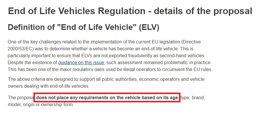 แต่การอ้างว่า EU เตรียมจะสั่งห้ามการซ่อมหรือครอบครองรถยนต์ที่มีอายุใช้งานเกินกว่า 15 ปีไม่เป็นความจริง เนื่องจากรถยนต์ที่ถูกจัดให้เป็นยานยนต์ที่หมดอายุ (ELV) ไม่ได้วัดจากอายุการใช้งานตามที่กล่าวอ้าง และยังเป็นนโยบายเพื่อบังคับใช้สำหรับผู้ประกอบการธุรกิจยานยนต์โดยเฉพาะ ไม่มีผลต่อการใช้งานของผู้ใช้รถยนต์แต่อย่างใด