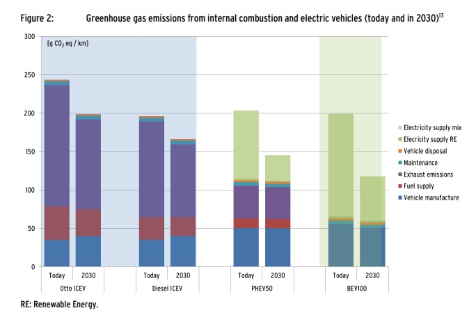 ข้อมูลจากสำนักงานสิ่งแวดล้อมของประเทศเยอรมนีประเมินว่า รถยนต์น้ำมันที่มีอายุการใช้งาน 168,000 กิโลเมตร มีสัดส่วนการปลดปล่อยคาร์บอนไดออกไซด์ต่อสิ่งแวดล้อมจากการผลิตรถยนต์คิดเป็น 15% ส่วนการปลดปล่อยคาร์บอนไดออกไซด์จากการขับคิดเป็น 64% ส่วนการผลิตเชื้อเพลิงอยู่ที่ 17% และการบำรุงรักษาและการทำลายซากรถประมาณ 4%