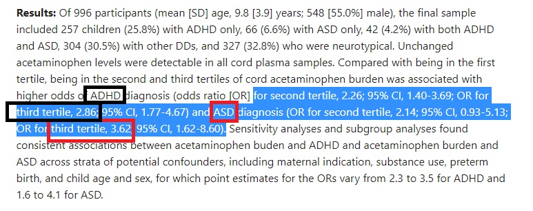 จากการแบ่งกลุ่มพบว่า ทารกที่เกิดจากมารดาที่มีปริมาณพาราเซตามอลในเลือดจากสายสะดือสูงที่สุด มีความเสี่ยงป่วยเป็นโรคโรคสมาธิสั้น (ADHD) มากกว่าทารกที่เกิดจากมารดาที่มีปริมาณพาราเซตามอลในเลือดจากสายสะดือน้อยที่สุดที่ 2.86 เท่า และมีความเสี่ยงป่วยด้วยโรคออทิสติกมากกว่า 3.62 เท่า