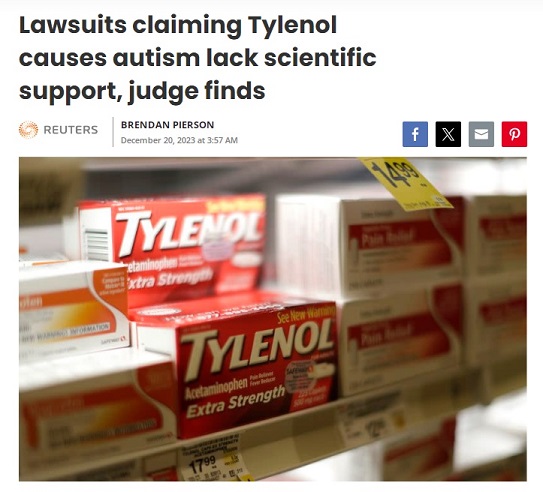 เมื่อเดือนธันวาคม 2023 มีการพิจารณาคดีฟ้องร้องค่าเสียหายต่อบรรดาร้านขายยาและบริษัทผู้ผลิตยา Tylenol โดยกลุ่มผู้ปกครองที่กล่าวหาว่า การใช้ยาพาราเซตามอลทำให้ลูกป่วยเป็นโรคออทิสติก