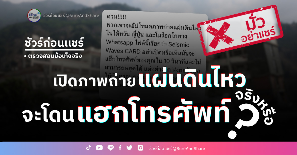 พวกเขาจะอัปโหลดภาพถ่ายแผ่นดินไหวในไต้หวัน ญี่ปุ่น และโมร็อกโกทาง Whatsapp ไฟล์นี้เรียกว่า Seismic Waves CARD อย่าเปิดหรือเห็นมันจะแฮ็กโทรศัพท์ของคุณใน 10 วินาทีและไม่สามารถหยุดได้ แต่อย่างใด ส่งต่อข้อมูลให้กับครอบครัวและเพื่อนของคุณ