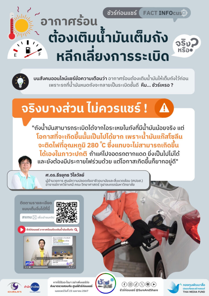 “โอกาสที่จะระเบิดจากการจอดรถตากแดดนั้นไม่มี เนื่องจากอุณหภูมิต้องสูงถึงจุดลุกติดไฟได้ หากเป็นน้ำมันแก๊สโซฮอล์ ประมาณ 300 องศาฯ หรือ 280 องศาฯ ซึ่งอุณหภูมิสูงขนาดนี้ไม่สามารถเกิดขึ้นได้ในภาวะปกติ ดังนั้นการเติมน้ำมันเต็มถังหรือไม่ประชาชนจึงไม่ต้องกังวล ส่วนคลิปที่แชร์มาแหล่งข้อมูลที่อ้างอิงเป็นเพียงแค่การทดสอบที่มีการควบคุมตัวแปรและการสร้างสถานการณ์เฉพาะเท่านั้น”