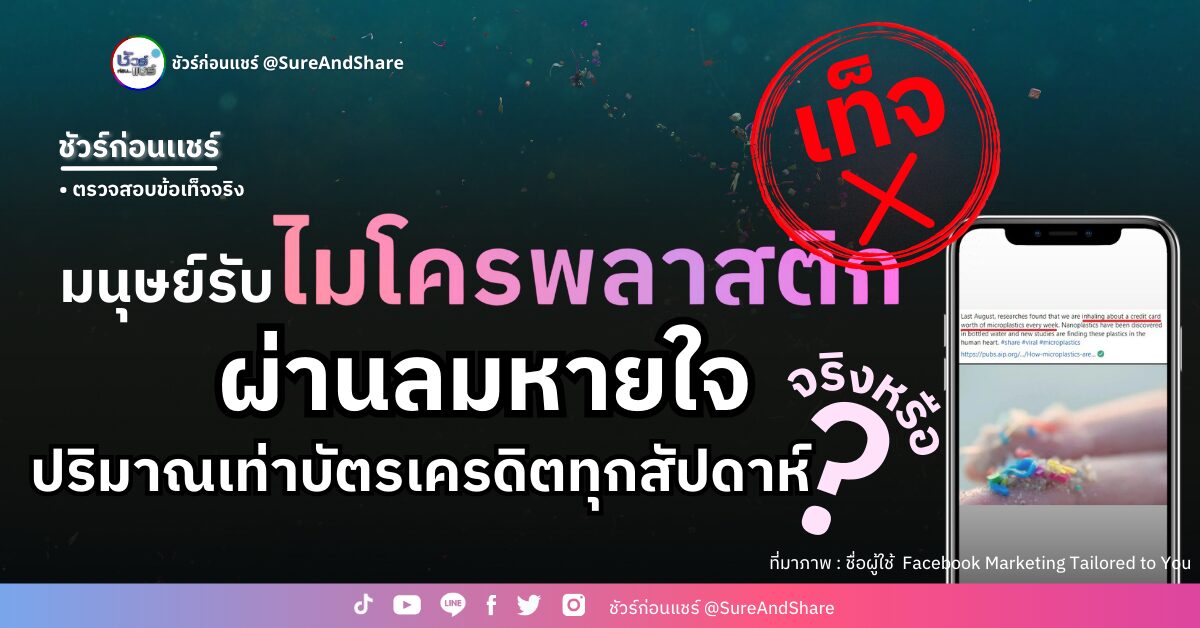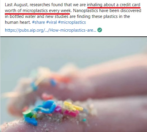 มีข้อมูลสร้างความเข้าใจผิดเผยแพร่จากคลิปวิดีโอของสำนักข่าว BBC โดยอ้างว่าในแต่ละสัปดาห์ มนุษย์หายใจเอาอนุภาคไมโครพลาสติกเข้าสู่ร่างกายในปริมาณประมาณ 5 กรัม หรือเทียบเท่ากับน้ำหนักบัตรเครดิต 1 ใบ กลายเป็นข้อมูลที่สำนักข่าวต่าง ๆ เช่น Independent, Science Daily, LiveScience, Yahoo News, Daily Mail และ IFL นำไปเผยแพร่ต่อและกลายเป็นข้อความที่ถูกแชร์ไปทั่วโลก