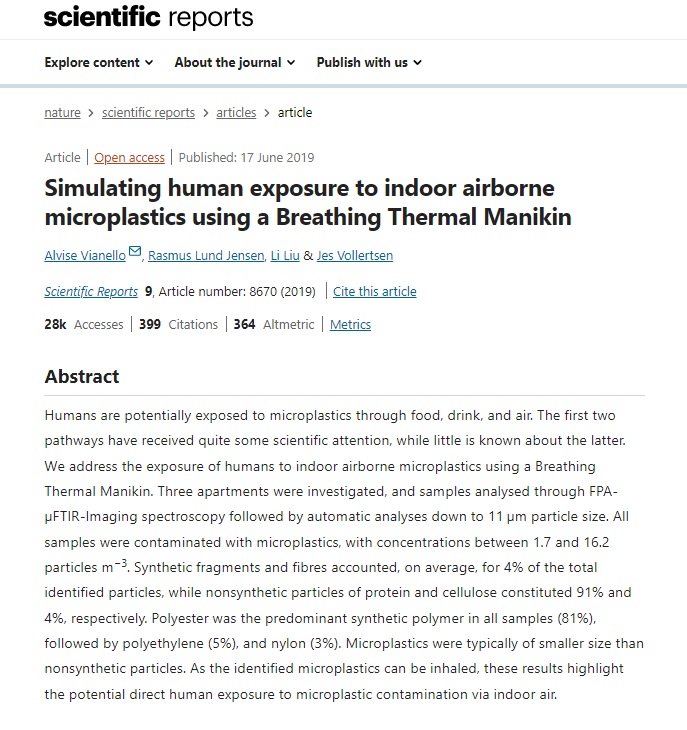 ทีมวิจัยใช้หุ่นจำลองชนิด Breathing Thermal Manikin เพื่อสำรวจอนุภาคไมโครพลาสติกในอาพาร์ตเมนต์ 3 แห่งที่ประเทศเดนมาร์ก โดยพบไมโครพลาสติกอยู่ในหุ่นจำลองทั้ง 3 ตัว ซึ่งมีอัตราส่วนอนุภาคไมโครพลาสติกอยู่ที่ 16.2 อนุภาคต่อลูกบาศก์เมตร ซึ่งผู้วิจัยลงความเห็นว่าอาจส่งผลเสียต่อสุขภาพ