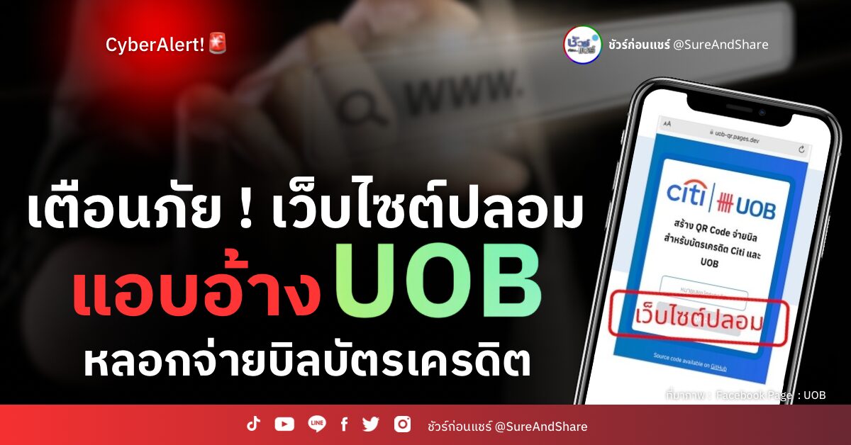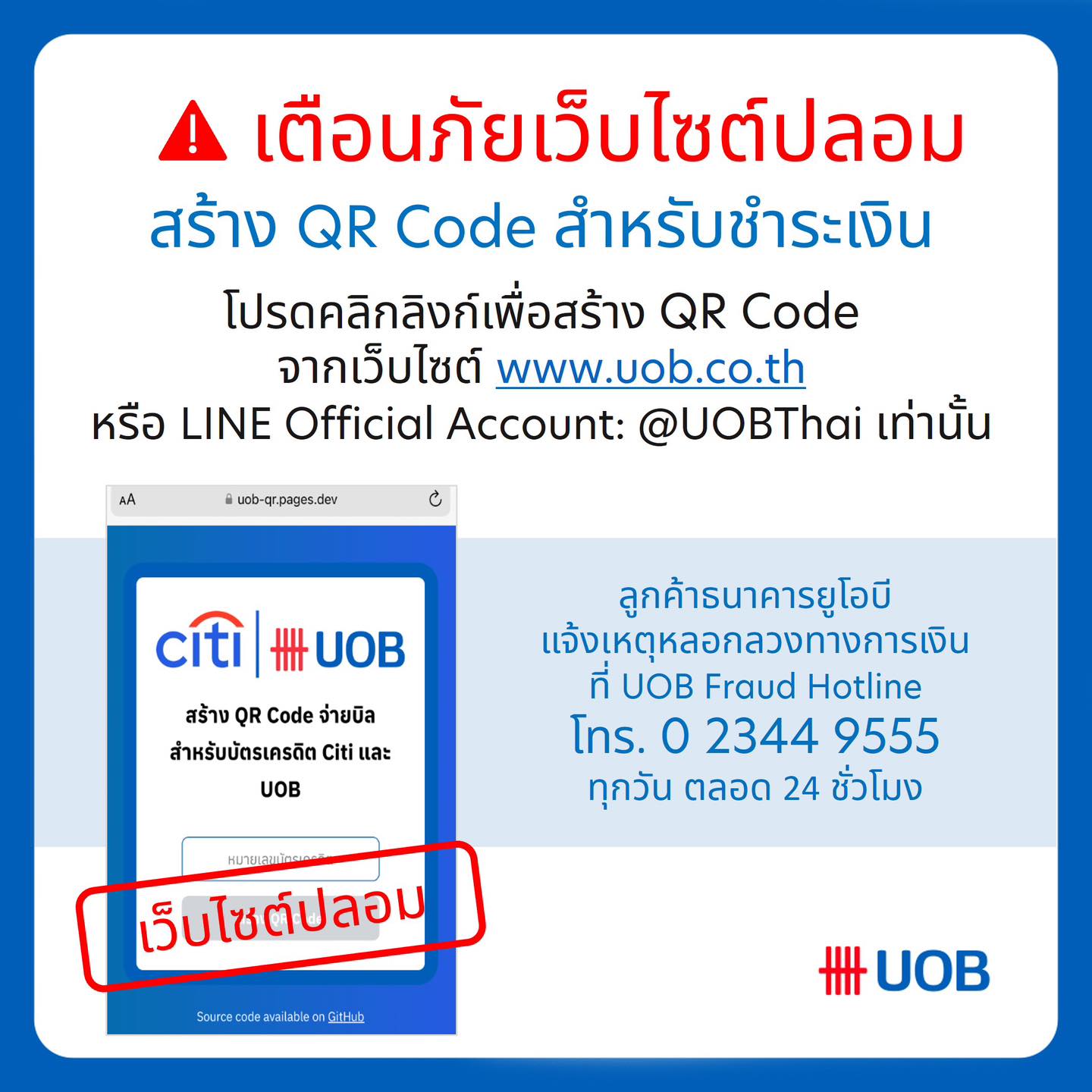 เพจเฟซบุ๊กธนาคาร UOB ประกาศเตือนภัยเว็บไซต์ปลอม สร้าง QR CODE สำหรับชำระเงินบิลค่าบัตรเครดิต Citi และ UOB โดยเว็บไซต์ของจริง ต้องชื่อ www.uob.co.th เท่านั้น และไลน์ Official @UOBThai เท่านั้น