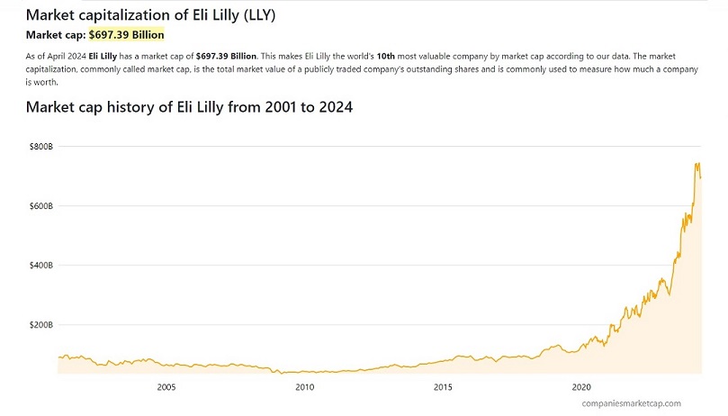 ความสำเร็จของยาลดน้ำหนักชื่อดัง ทำให้บริษัท Eli Lilly ผู้ผลิตยา Semaglutide กลายเป็นบริษัทผู้ผลิตยาอันดับหนึ่งของโลก มีมูลค่าราคาตลาดสูงเป็นอันดับที่ 10 ของโลกหรือมีมูลค่ามากกว่า 7 แสนล้านดอลลาร์สหรัฐฯ