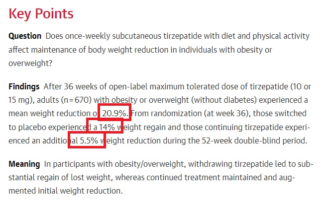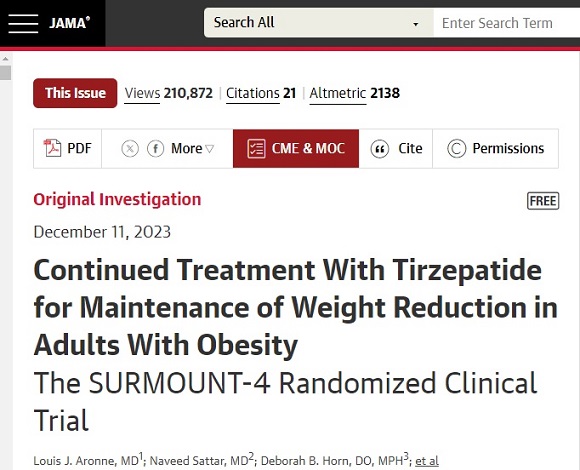เมื่อเดือนธันวาคม 2023 มีงานวิจัยที่ได้รับการสนับสนุนจากบริษัท Eli Lilly ตีพิมพ์ในวารสารการแพทย์ JAMA เป็นการทดลองแบบสุ่มและมีกลุ่มควบคุม โดยทีมวิจัยต้องการศึกษาว่า หลังจากใช้ยา Tirzepatide เป็นเวลา 36 สัปดาห์ แล้วหยุดยาเป็นเวลา 1 ปี ผู้ที่หยุดยาจะสามารถลดน้ำหนักต่อไปได้หรือไม่