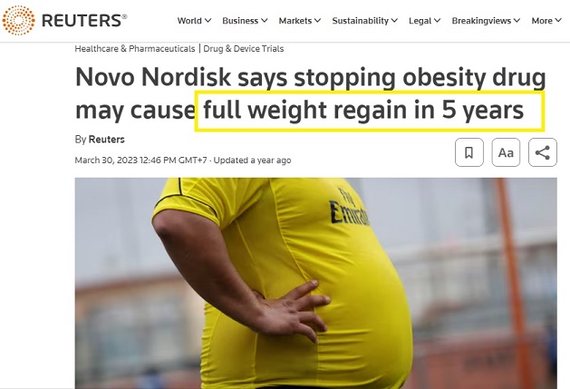 ด้านบริษัท Novo Nordisk ผู้ผลิตยาลดน้ำหนัก Semaglutide ทั้ง Ozempic และ Wegovy เปิดเผยรายงานเมื่อเดือนมีนาคม 2024 ว่า ผู้ที่หยุดใช้ยา Wegovy จะกลับมามีน้ำหนักตัวเท่าเดิมภายในเวลา 5 ปี