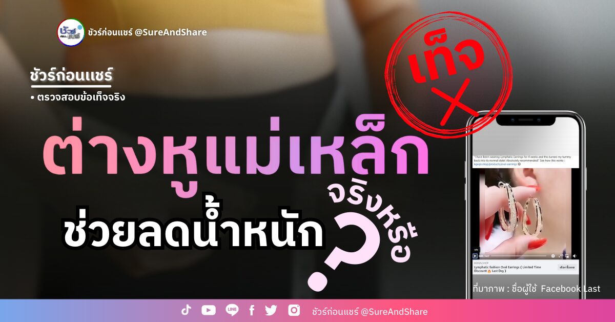 มีโฆษณาข้อมูลเท็จเผยแพร่ทาง Facebook ในต่างประเทศ โดยอ้างสรรพคุณของต่างหูแม่เหล็กชนิด Magnetic Lymphatic Earring ว่ามีคุณสมบัติช่วยให้ผู้สวมใส่สามารถลดน้ำหนักได้อย่างรวดเร็ว